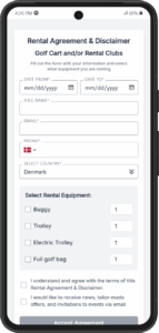 - Multiple rental items in one flow (e.g., buggies, trolleys, clubs)