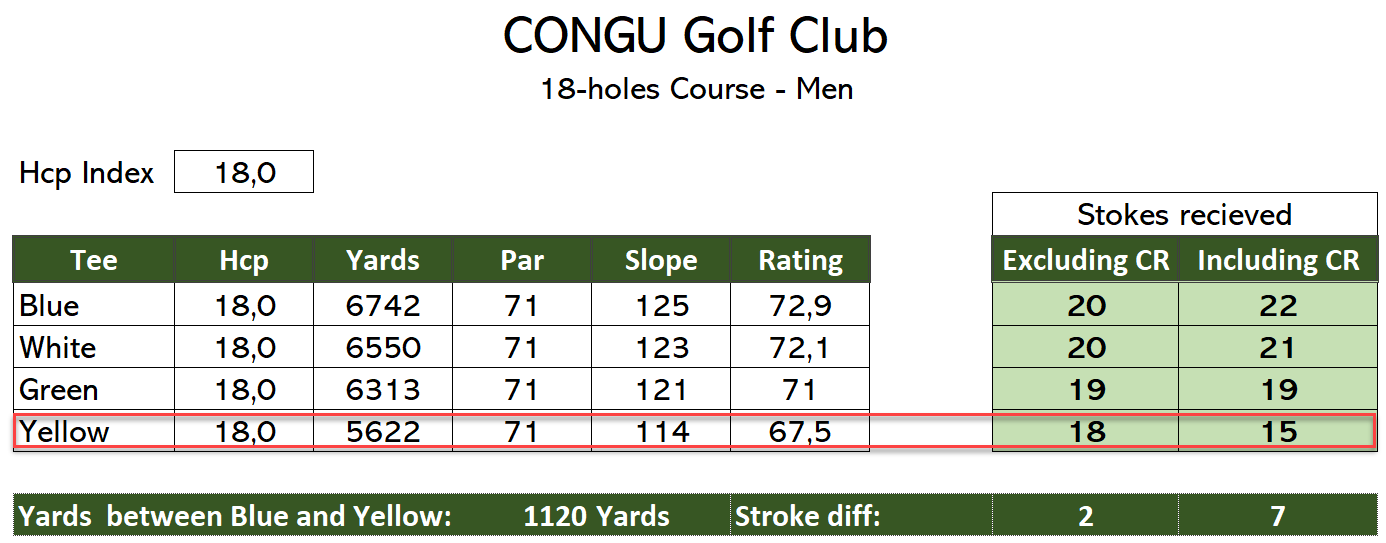 When “Excluding Course Rating minus Par”, the player has 4 received strokes no matter what tee the player chooses. Had the player been using “Including Course Rating minus Par” to calculate the Course Handicap, the received strokes would have been 6, so 2 more strokes if the player was outside the CONGU.